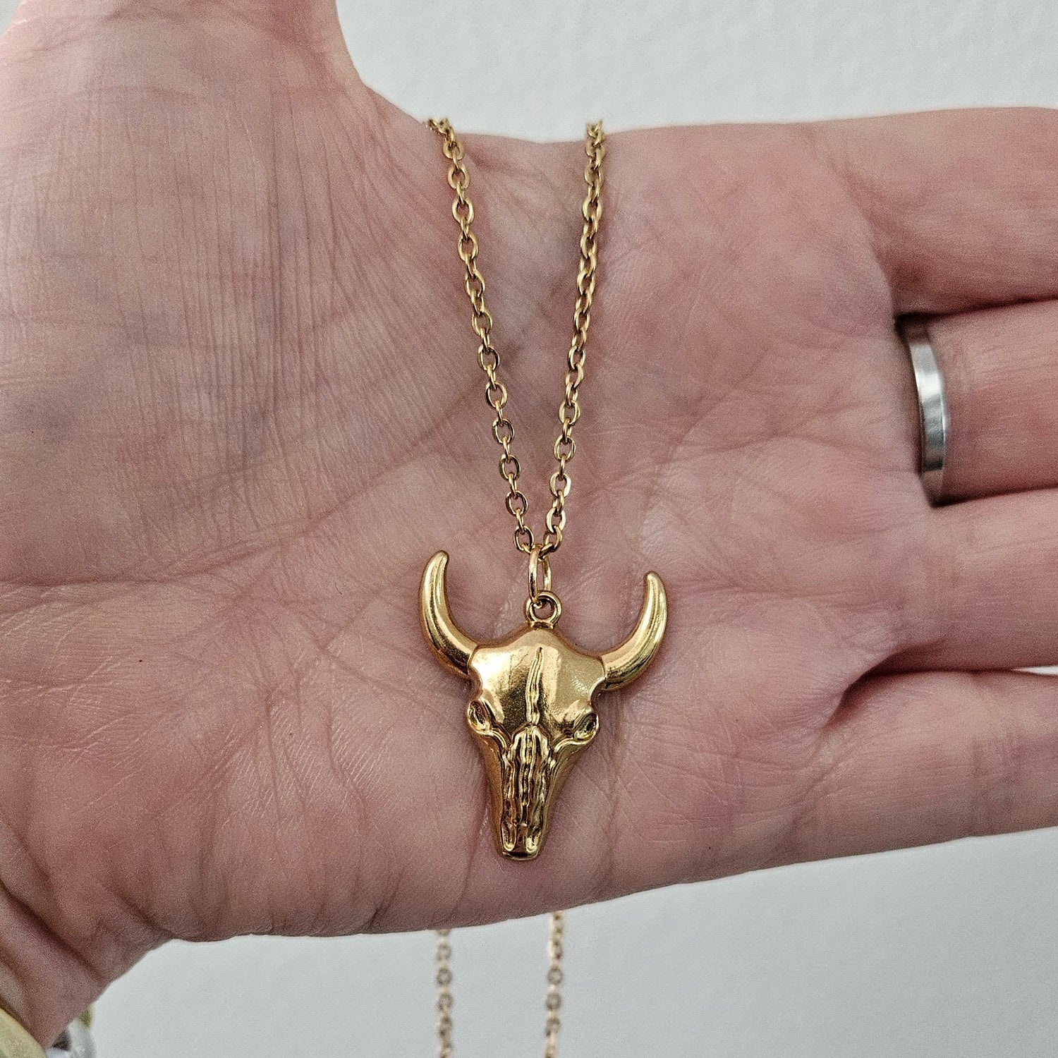 The Corina Necklace features a bold bull skull pendant — a timeless symbol of strength and grounding energy. Crafted in stainless steel with a polished golden finish, this piece adds a touch of western-boho charm to any outfit.