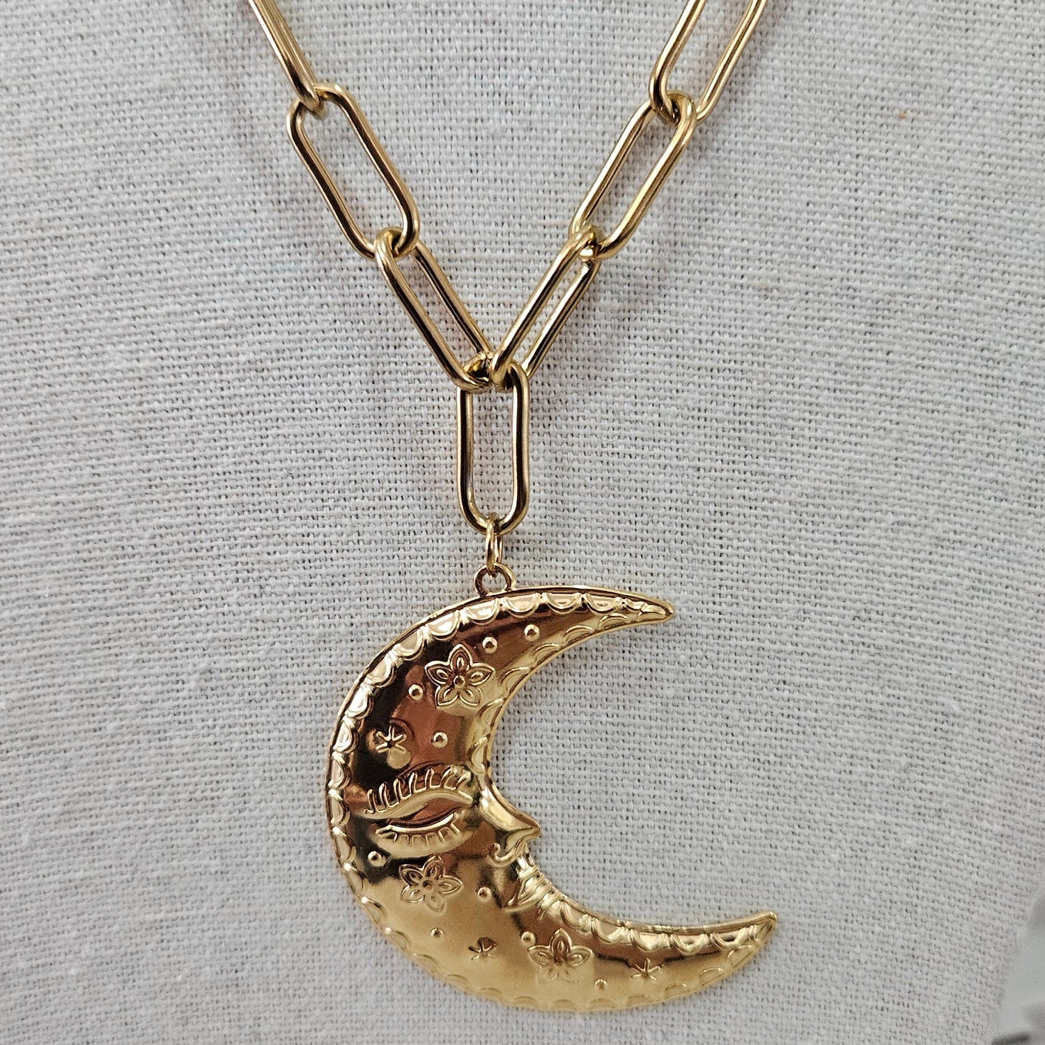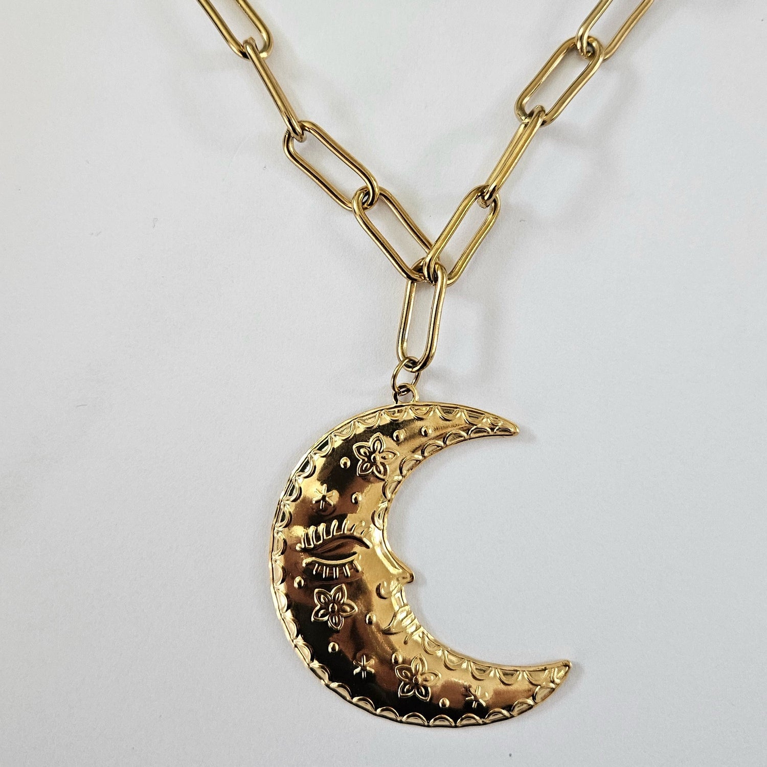 A celestial statement for your bold days. Dolores features a dreamy crescent-moon pendant with engraved floral details, paired with a chunky stainless-steel chain in a warm gold-tone finish — eye-catching, mystical, and unapologetically chic.