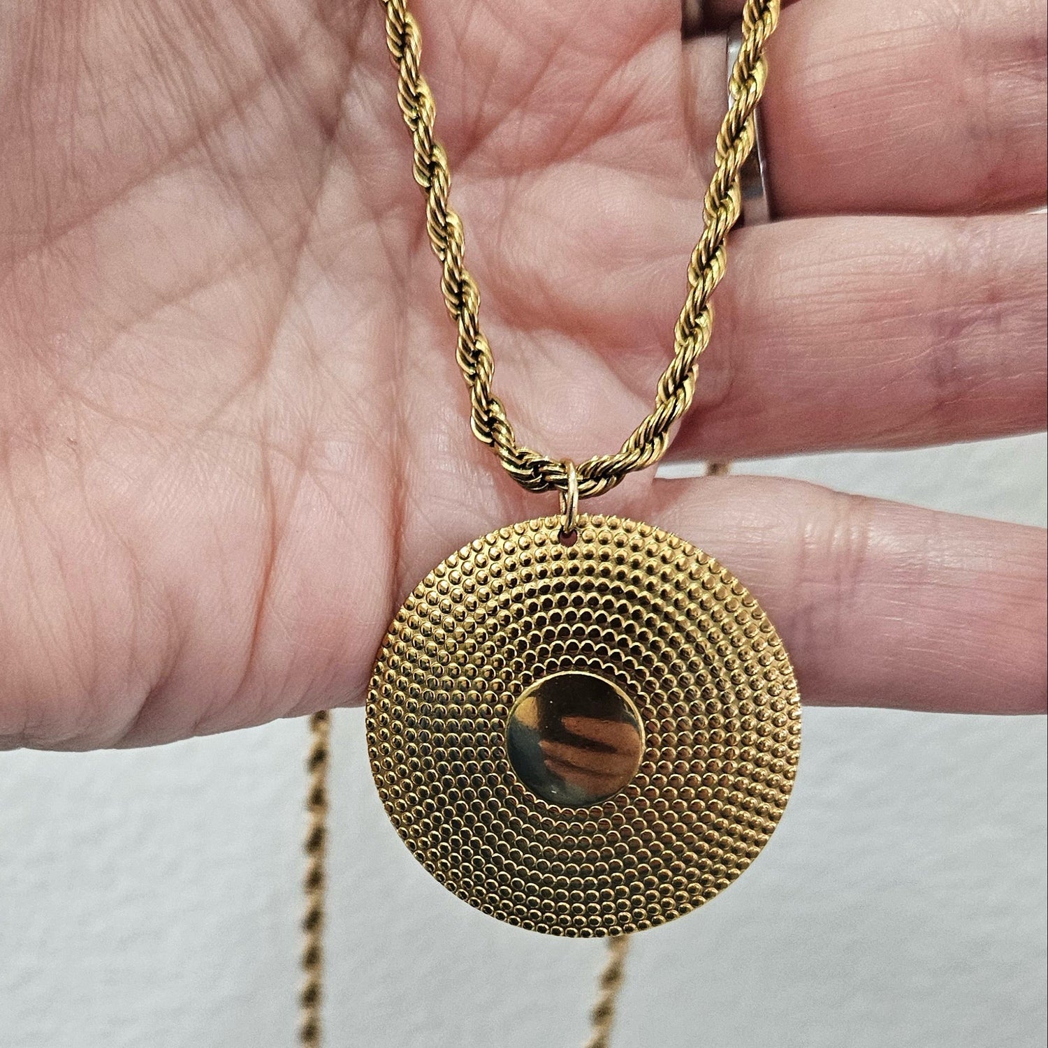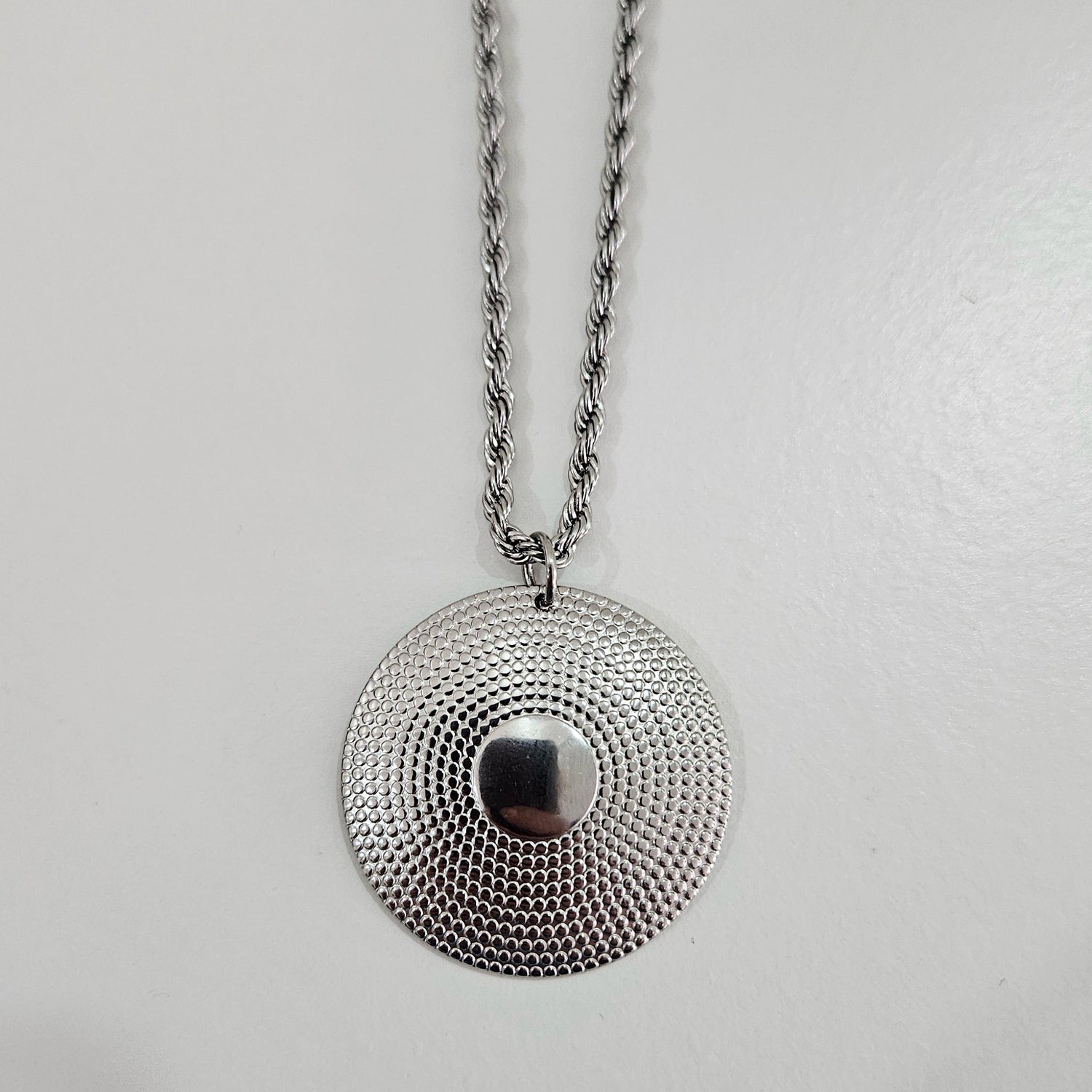 The Lyria Necklace is a timeless and modern piece designed to elevate any outfit. Its long, rope-style chain is paired with a textured circular pendant that catches the light beautifully, creating a refined yet statement look.