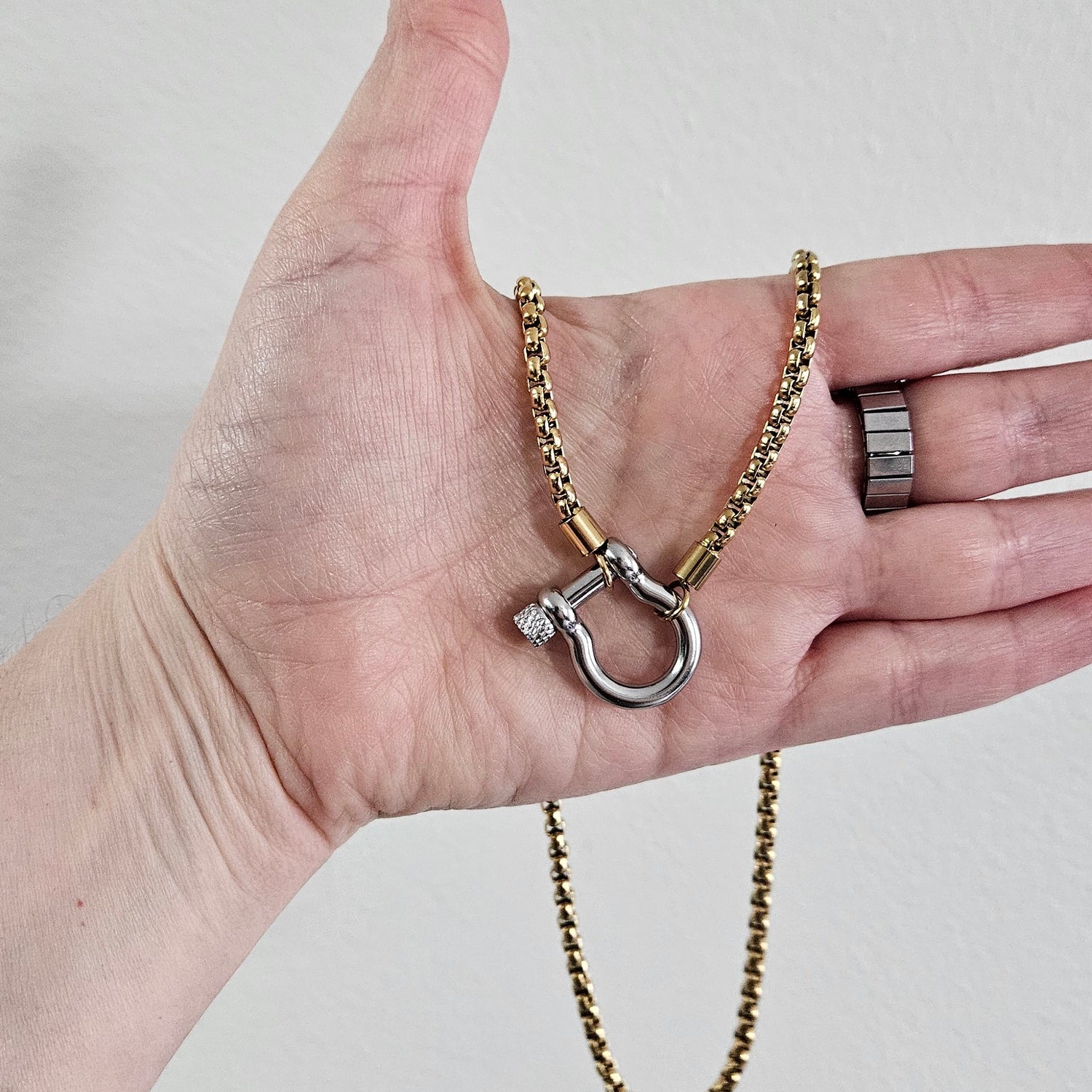The Marce necklace is crafted in high-quality stainless steel, featuring a bold gold chain and a contrasting silver-toned pendant. Its modern and versatile design makes it perfect for everyday wear or as a statement piece.