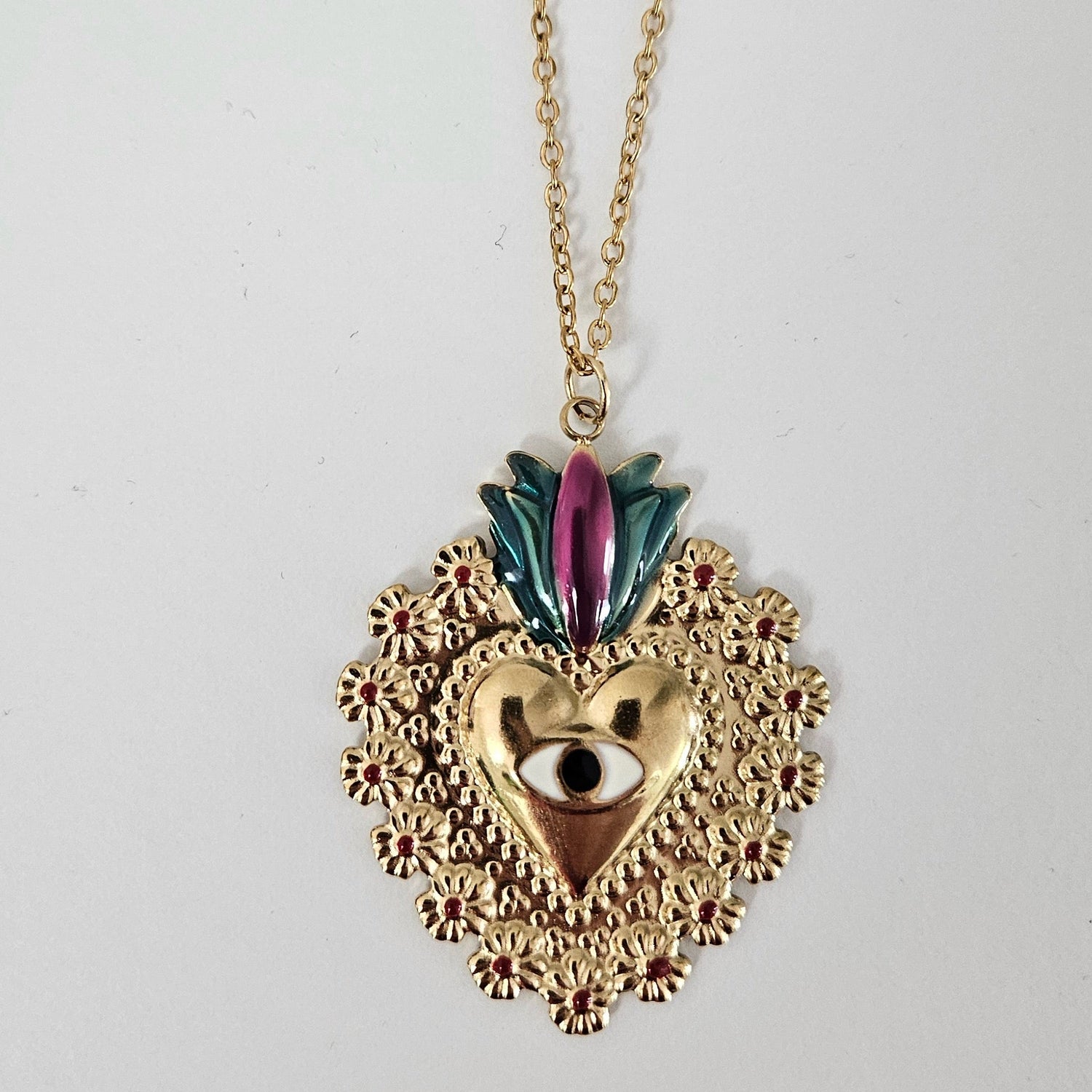 The Mirabel Necklace is a statement piece inspired by sacred symbolism and Mexican folk art. Its intricate gold stainless steel heart pendant features a mystical eye at the center, framed by delicate floral details and crowned with vibrant enamel accents in green and magenta tones.
