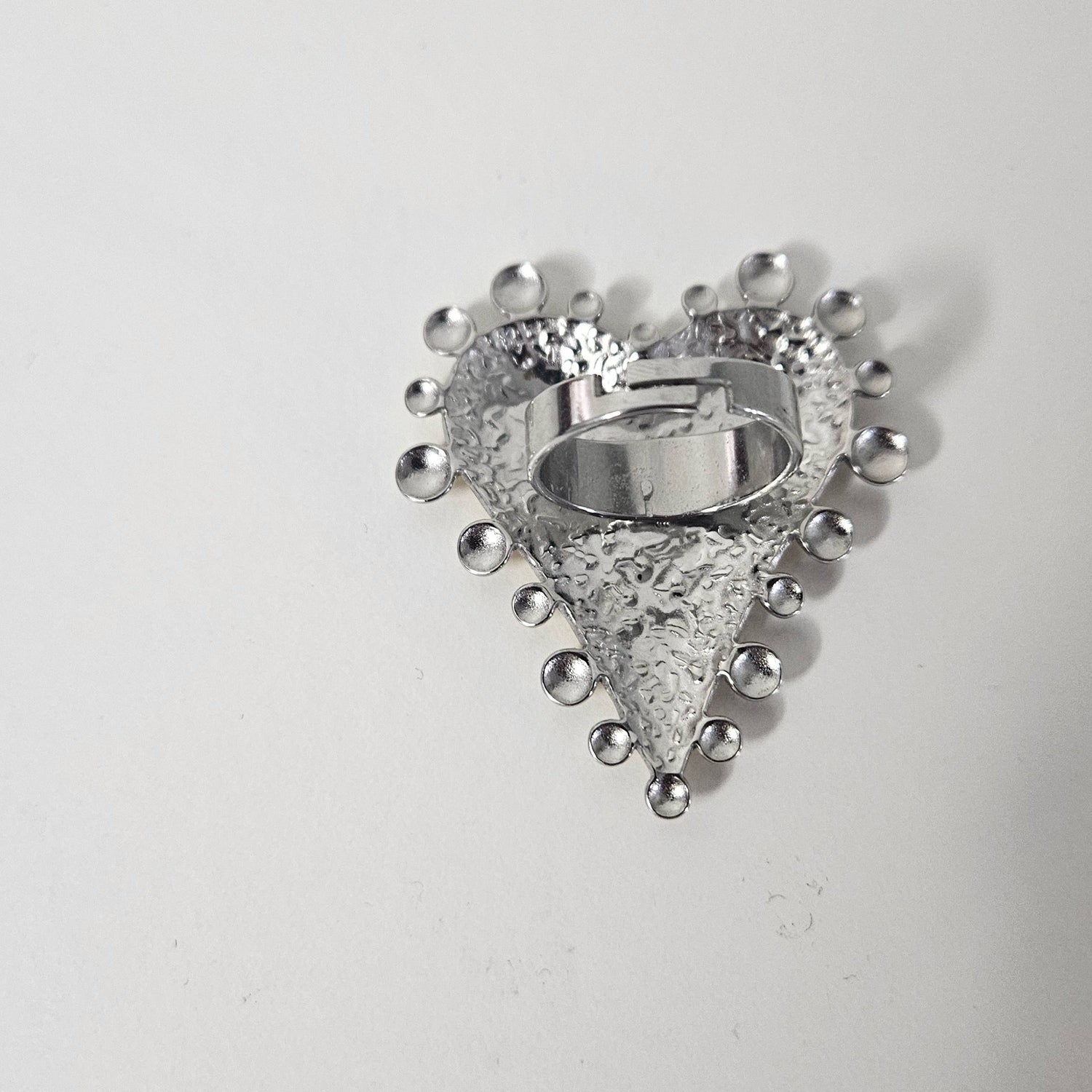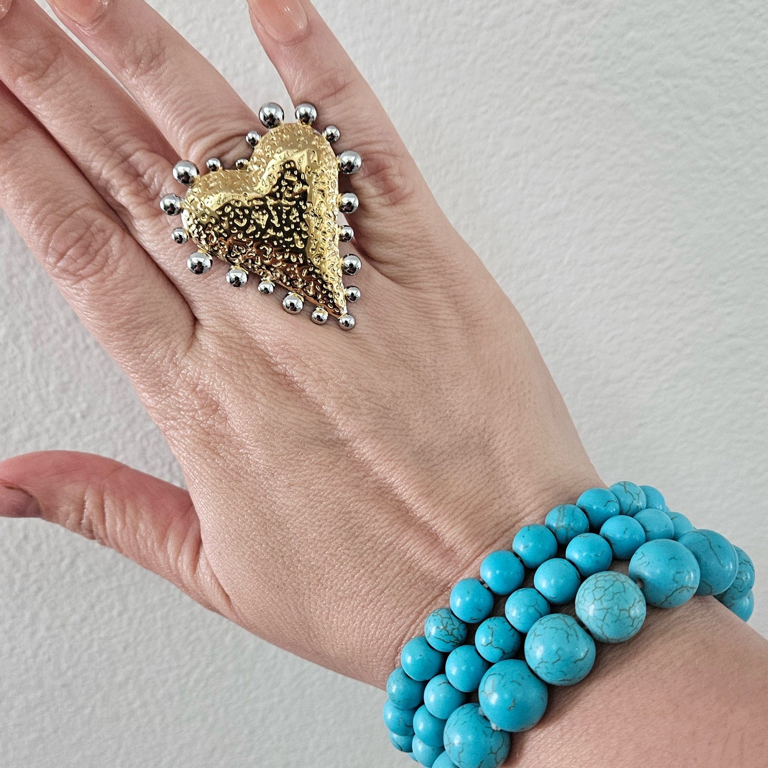 The Mirsa Ring is a striking piece designed to capture attention with its bold sacred-heart design. Crafted from stainless steel, it features a mix of gold and silver tones, adding contrast and texture for a modern yet timeless look. Its adjustable band ensures a comfortable fit on any finger, while its durable finish resists tarnish — made to shine with every outfit.