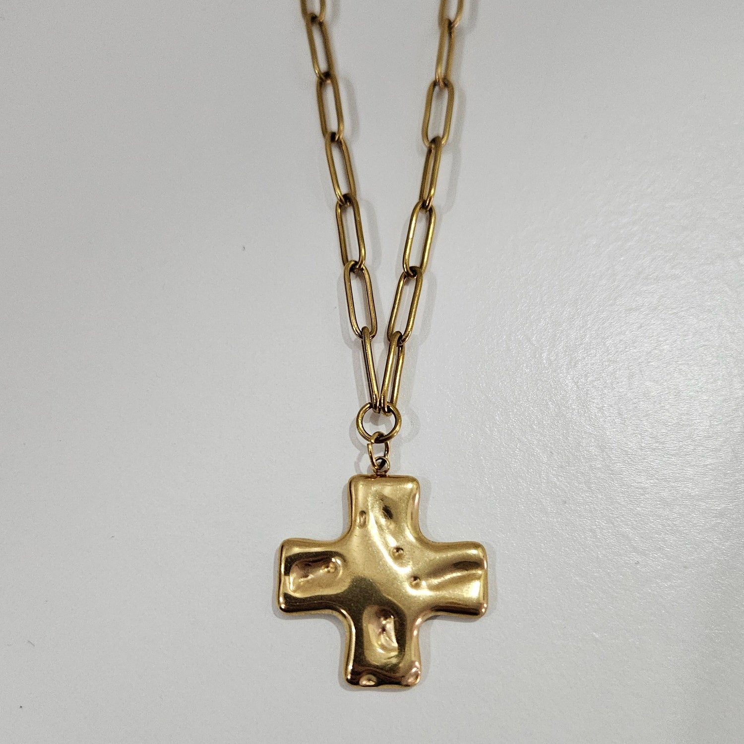 The Salomé Necklace is a statement piece crafted from stainless steel, featuring a bold, irregular cross pendant with a high-shine finish. Its unique, organic texture gives a modern twist to a classic symbol, while the paperclip-style chain adds an elegant yet edgy touch.
