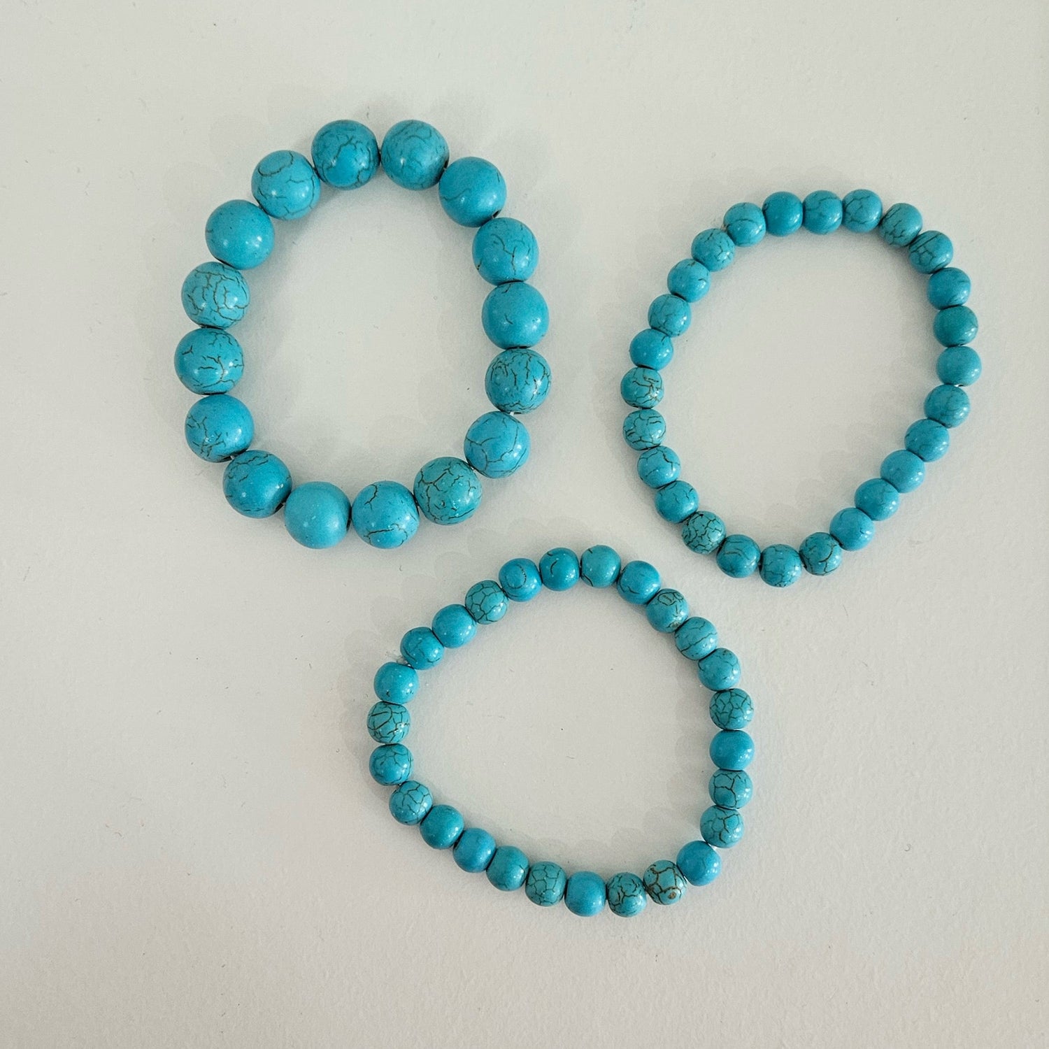 The Xara Bracelet Set includes three elastic turquoise bead bracelets designed to bring color, balance, and a touch of boho charm to your everyday looks. Each piece features smooth round beads with unique marbling, offering a fresh, artisanal finish that stands out alone or stacked together.